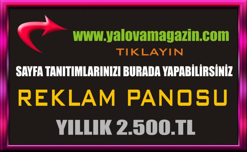 | Tanıtım ve reklamlarınız sayfamızda yayınlayabilirsinizYalova Magazin olarak firma tanıtımları ve sayfa tasarımları için yıllık olarak çok uygun bir fiyat belirledik. Reklam panolarına tıklayarak bize ulaşabilirsiniz. [Devamını Oku...]